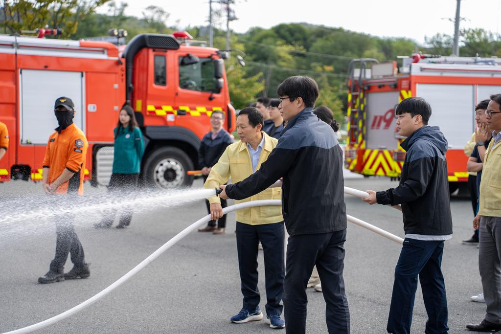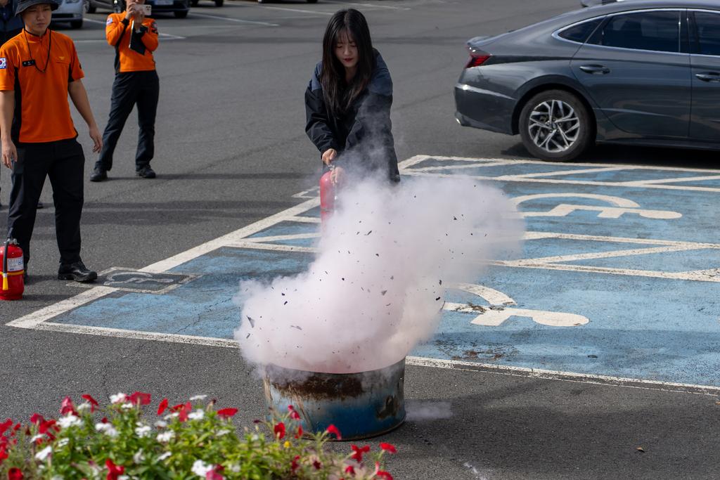 훈련은 특정 층 사무실에서 화재가 발생한 상황을 가정해 진행되었으며, ▲화재감지기 작동, ▲비상 방송 및 119 신고, ▲소화기·옥내소화전 활용 초기 진화, ▲소방차 출동 및 방수 시연, ▲종합 강평 순으로 이어졌다.