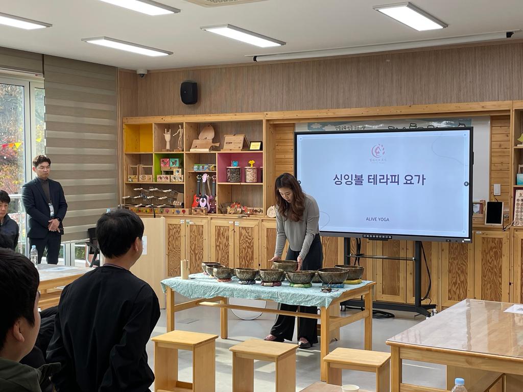 오전에는 싱잉볼 힐링 프로그램과 요가 테라피를 통해 일상 업무에서 쌓인 피로를 해소하고, 근골격계 질환 예방을 위한 실용적인 동작을 배우는 시간을 가졌다. 이어 진행된 명상과 호흡 이완 프로그램은 참가자들의 심신 안정과 집중력 향상에 도움을 주었다.
