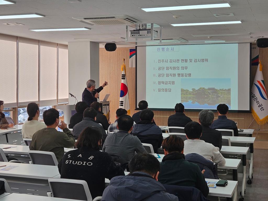 이번 교육은 진주시 전현수 감사관을 초청해 진행했으며, 공정하고 투명한 조직운영을 위한 임직원의 청렴 의식 제고를 목적으로 마련됐다.